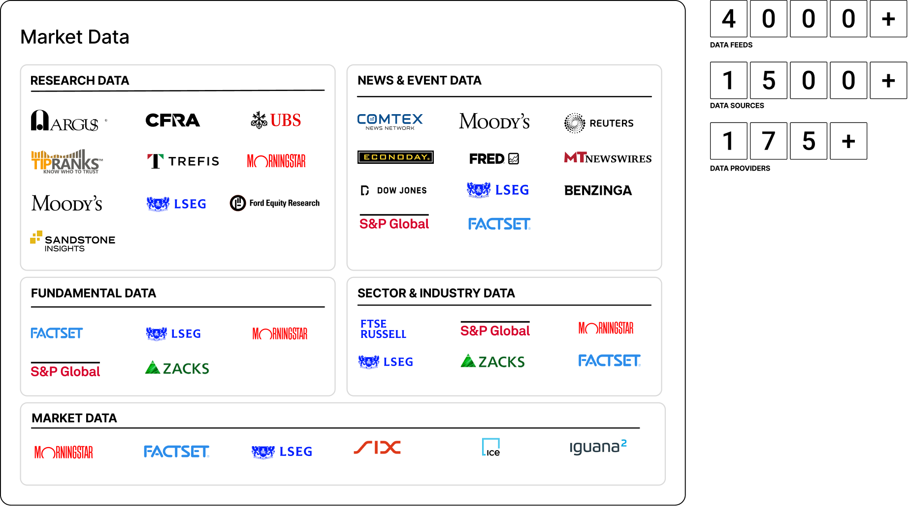 We have established relationships with a large number of data providers that help you meet specialized requirements. We consume and manage over 4,000 unique feeds from 175+ third-party data providers, all beautifully integrated and normalised to deliver ready to use, purpose-built visualisations and data.