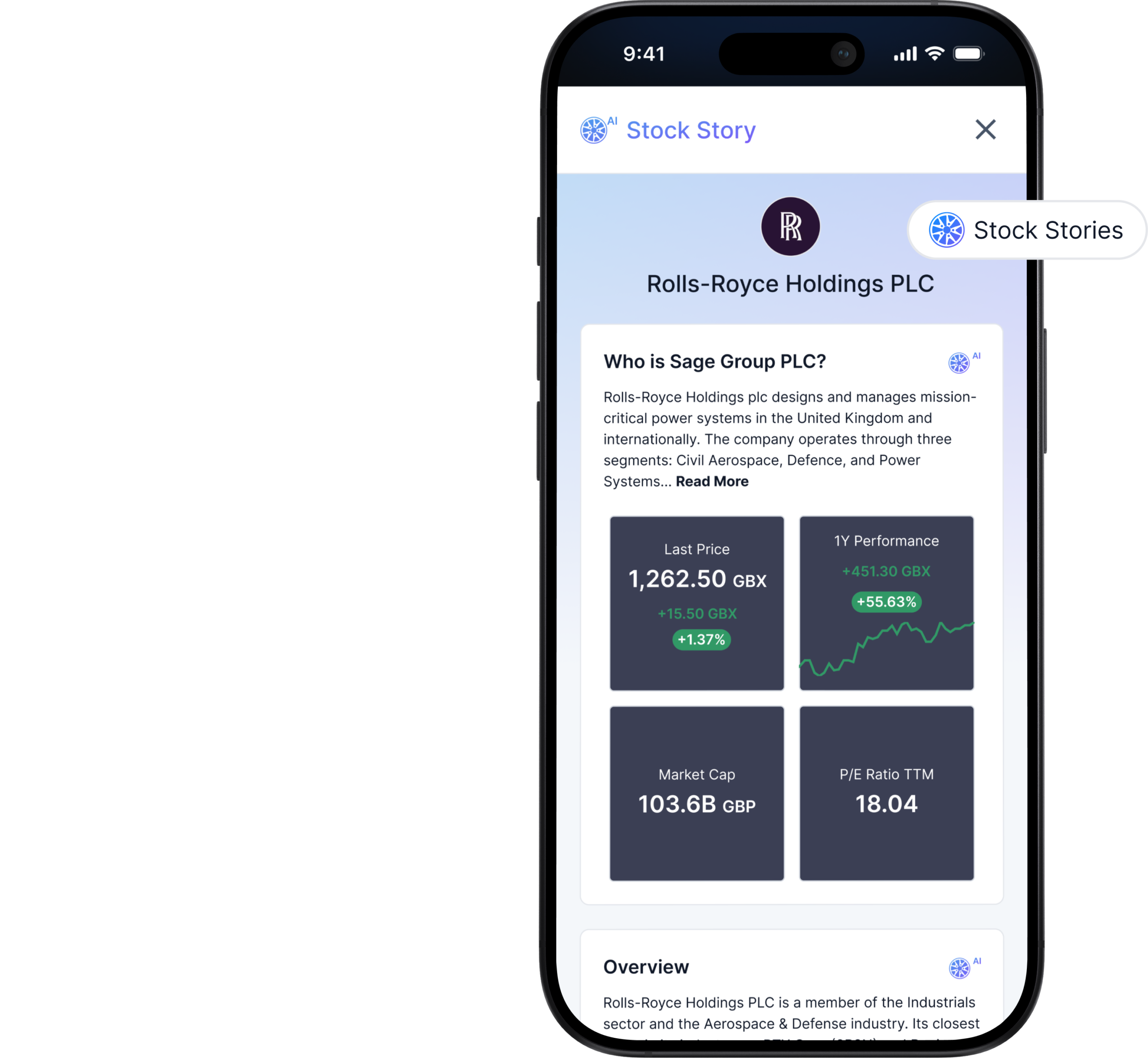 Turn complex market data into compelling, easy-to-grasp narratives that keep investors informed and engaged. Stock Stories combines real-time market feeds with compliant AI-driven SmartText™ to explain the “why” behind performance—helping investors see the bigger picture, spot opportunities and make confident decisions.