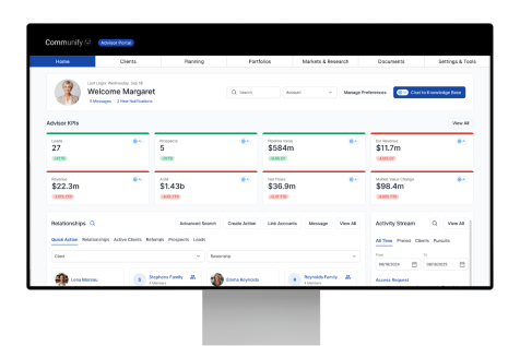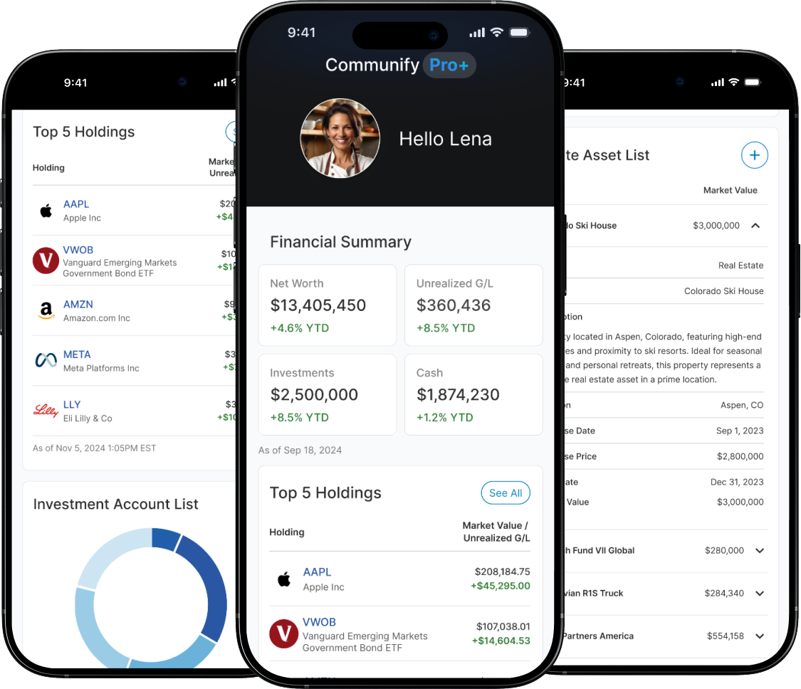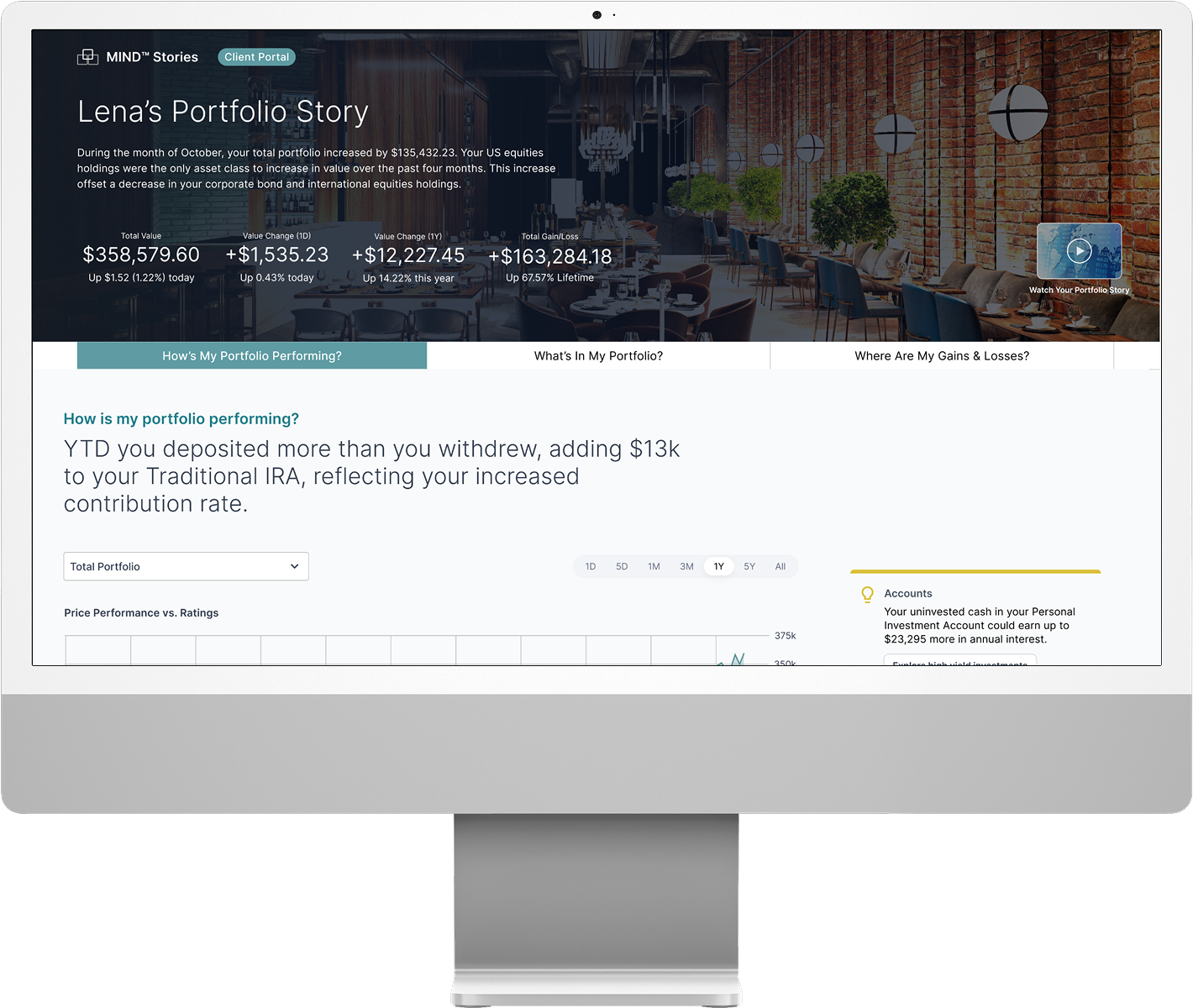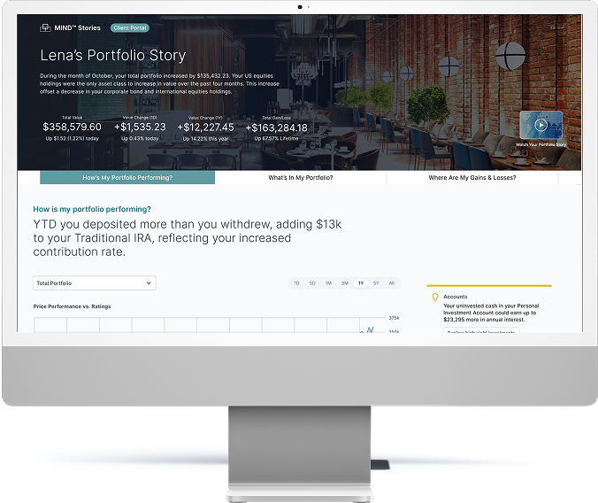 Transform every client interaction into a premium, personalized experience that builds trust and deepens relationships. Give your advised clients the comprehensive wealth views and engaging insights they expect, delivered seamlessly across all touch points—without adding burden to your advisory teams.