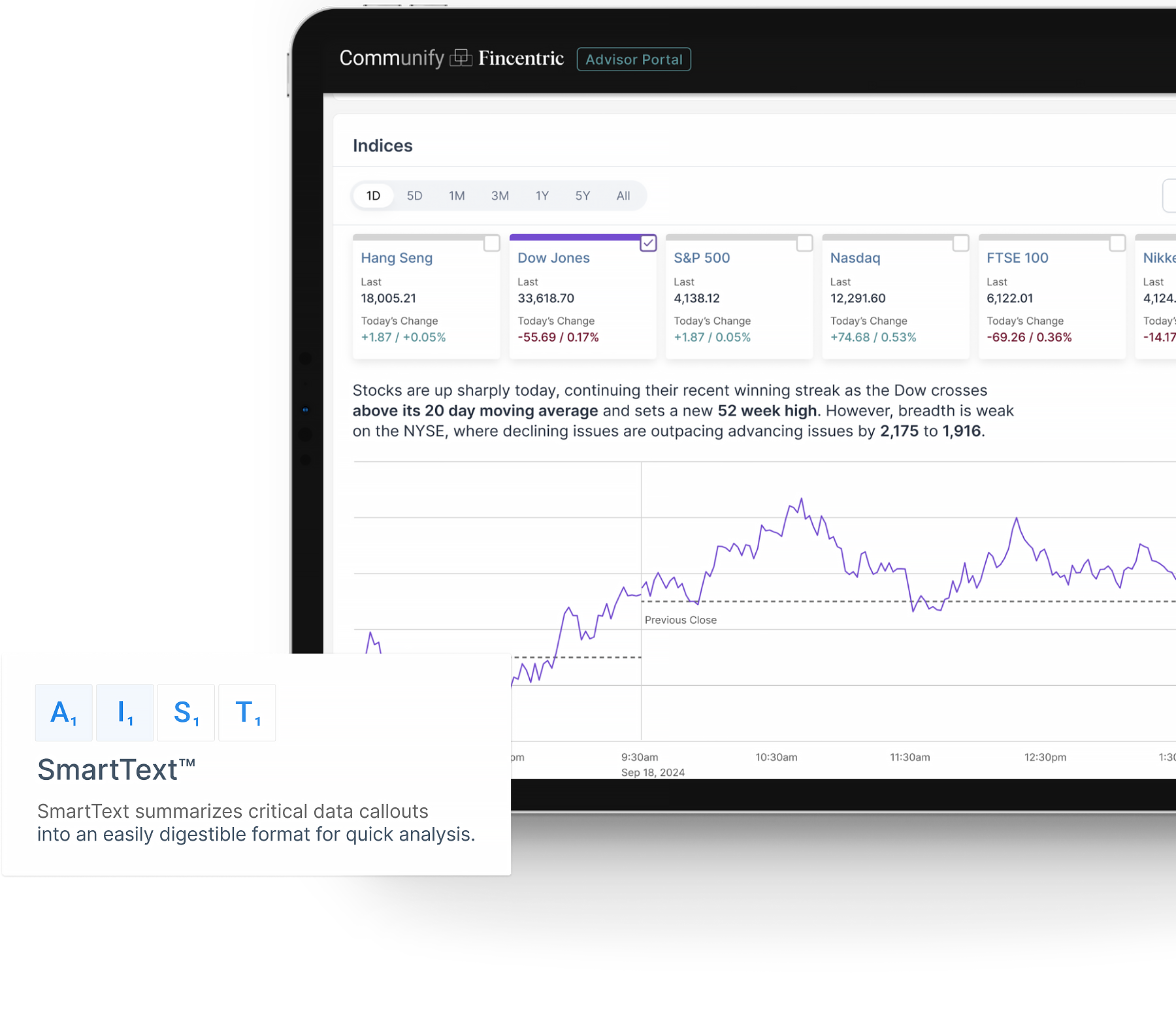 SmartText allows for flexibility and endless implementation options. Communify's vast library of designs is uniquely positioned to engage data-driven SmartText models in a way that can examine specific financial topics in great detail or integrate multiple issues for a deeper understanding of the financial world. To illustrate the depth of capability, SmartText can efficiently deliver information on dividends, real-time stock performance, or the valuation and profitability of a company compared to its industry.