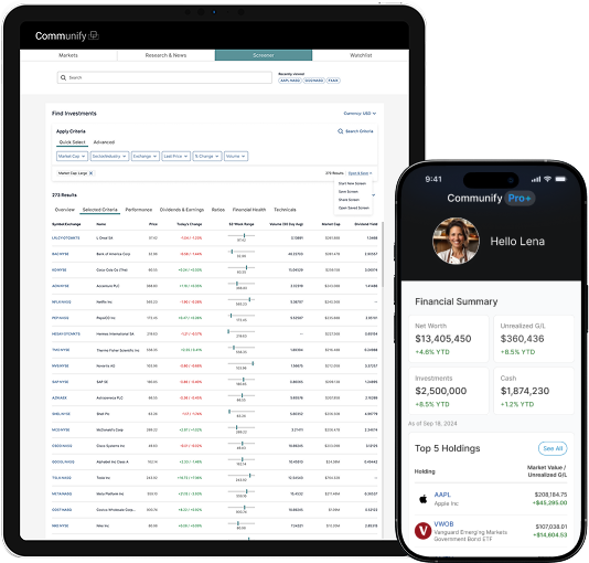 Robust client data views that aggregate and drill-in across relationship profiles, client profiles, portfolios and accounts and securities. Create custom portfolios leveraging apps such as scenario analysis, model portfolios, tax scenarios, benchmark comparisons, correlation matrices, dividend projection and more.