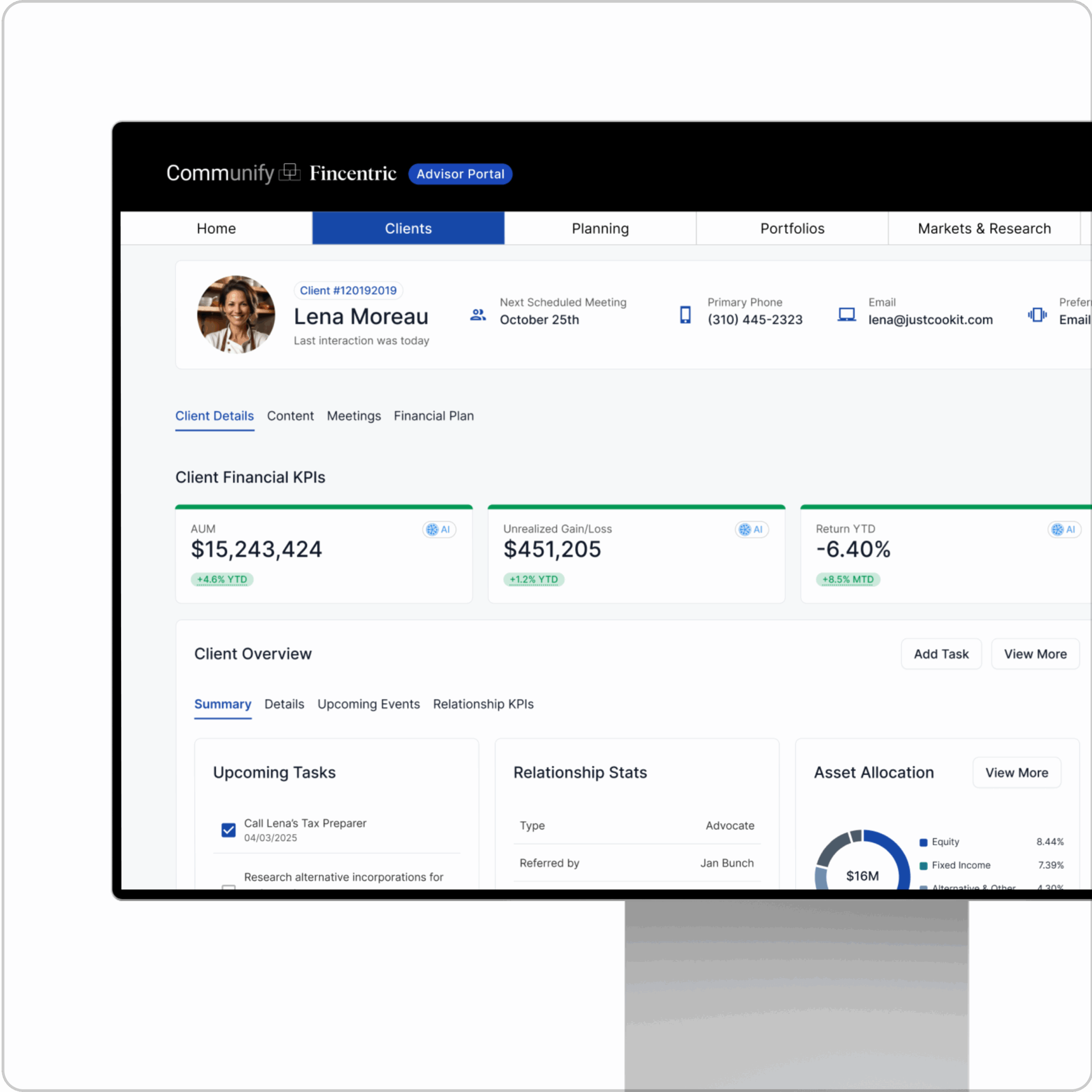 A comprehensive and dynamic dashboard that provides an endless diversity of insights into the investor’s financial life. Simple and seamless collaboration and communication create engagement that drives clients to self-provide more structured data while elevating their perceived value of the adviser.